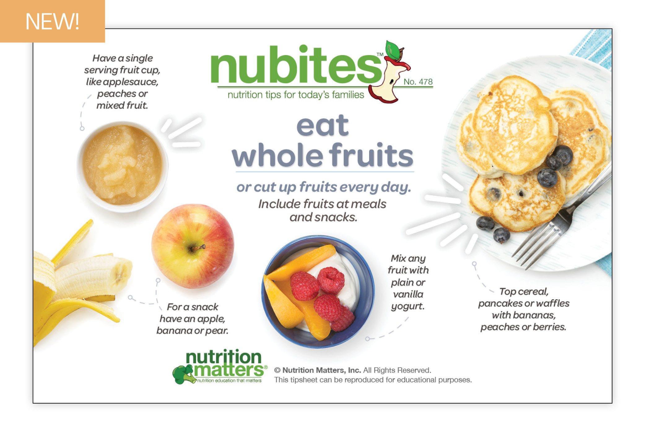 NuBites™ tipsheets are reproducible, in part or whole, for use with your clients. Copies may be made for educational purposes only, and under no circumstances may they be sold. Nubites cannot be compiled into other educational forms such as a tearsheet, brochure or recipe book. The name "Nutrition Matters Inc." and copyright must appear on all copies. If using part of the publication (recipe, article), please include "Nutrition Matters Inc. - reprinted with permission" on document.