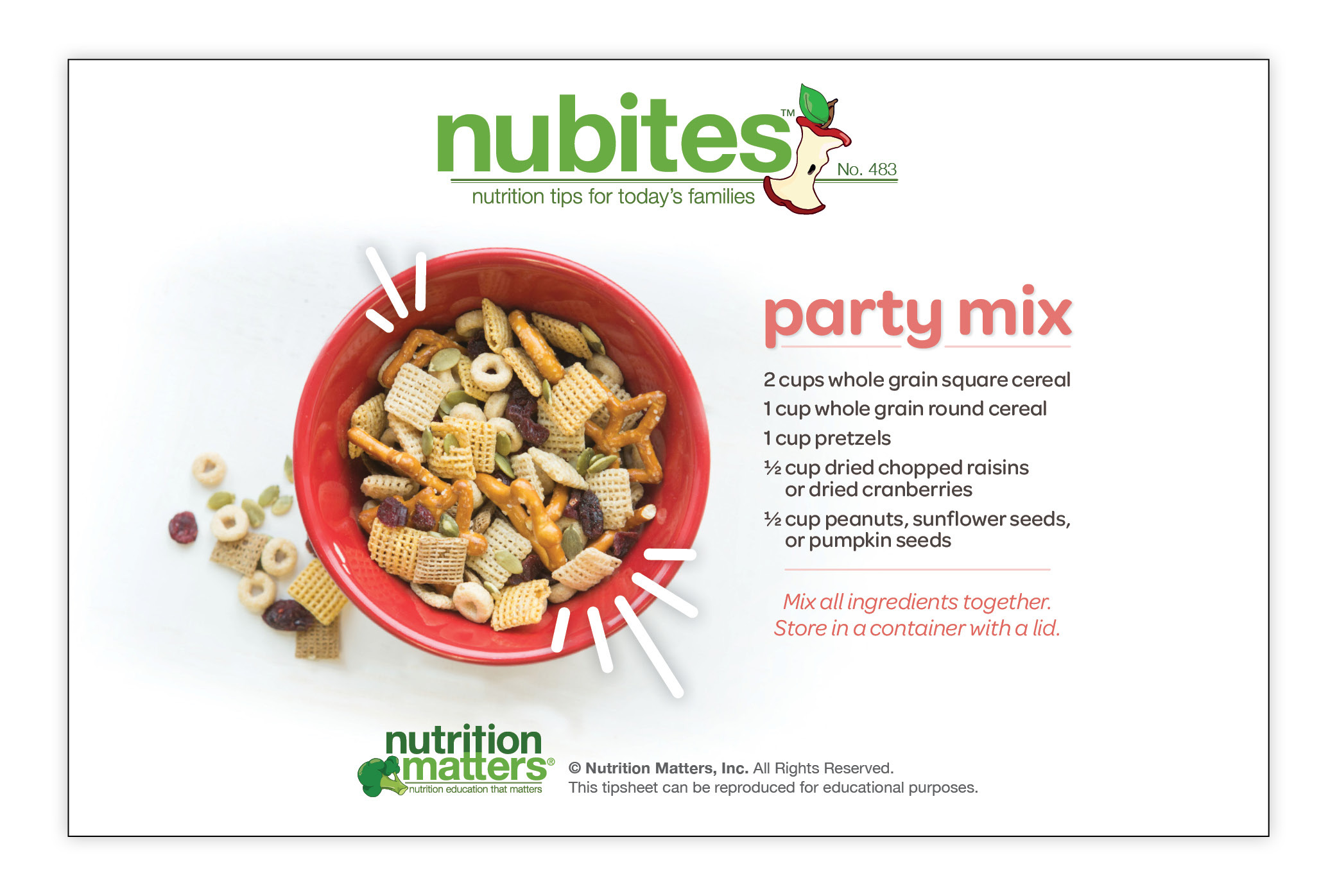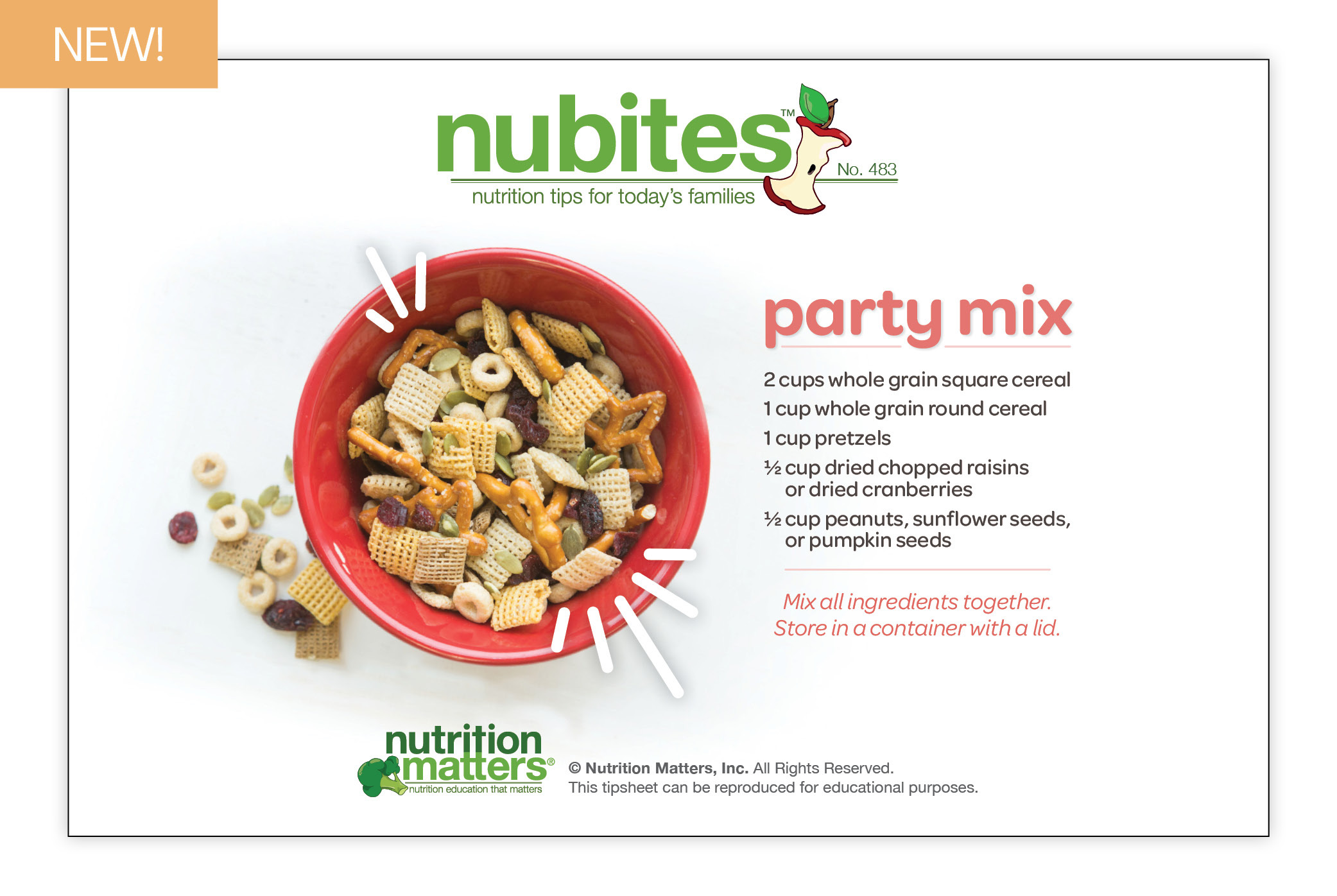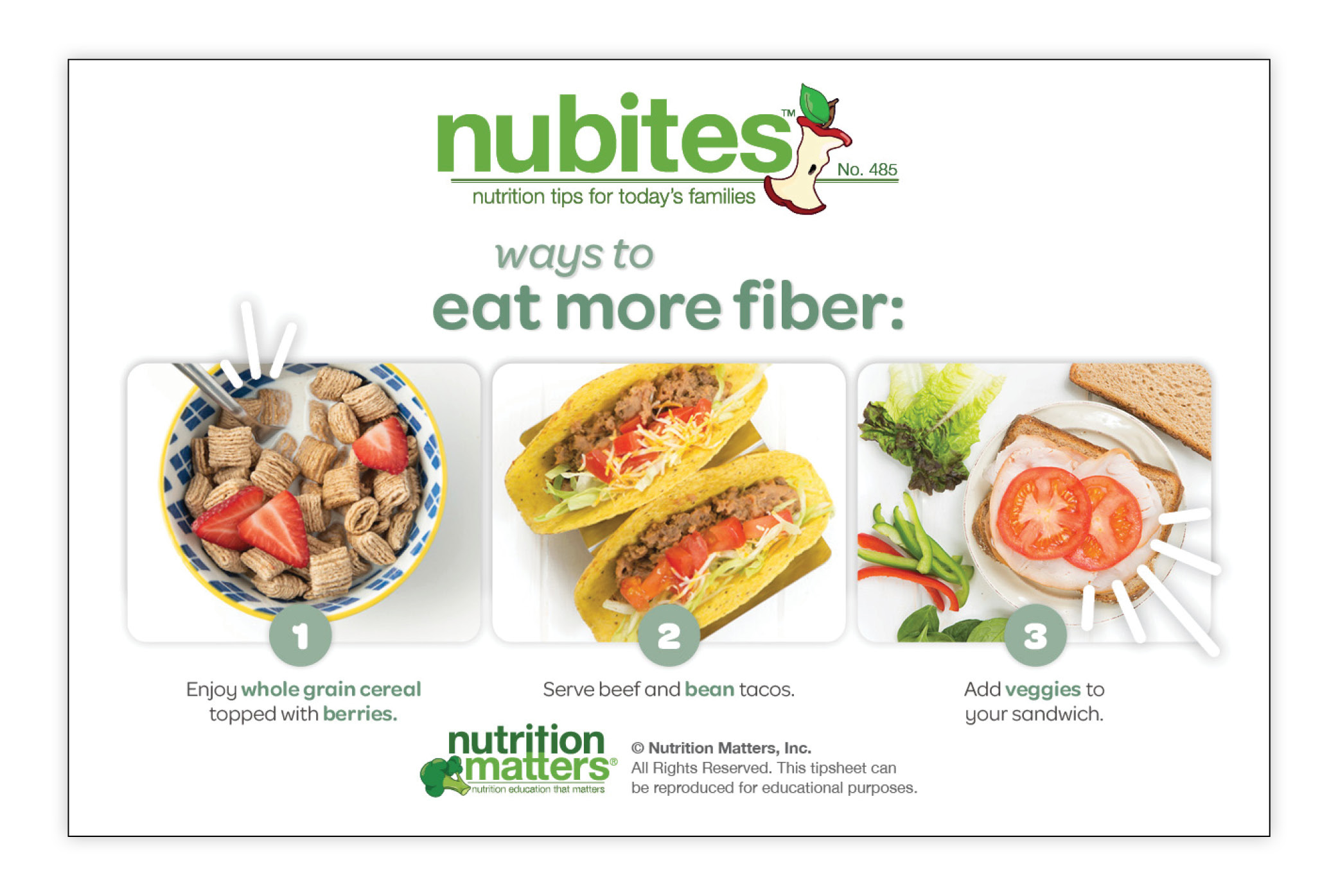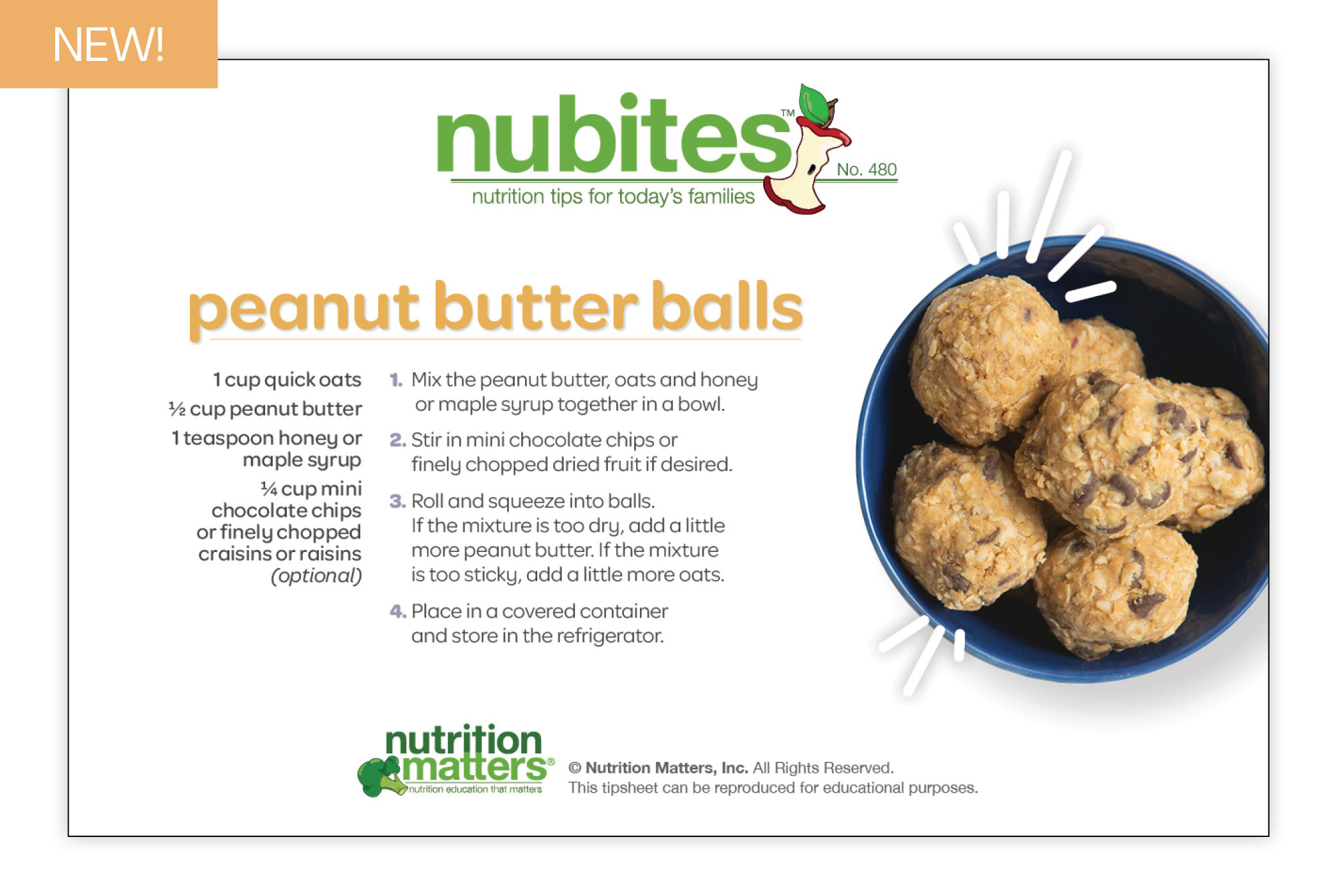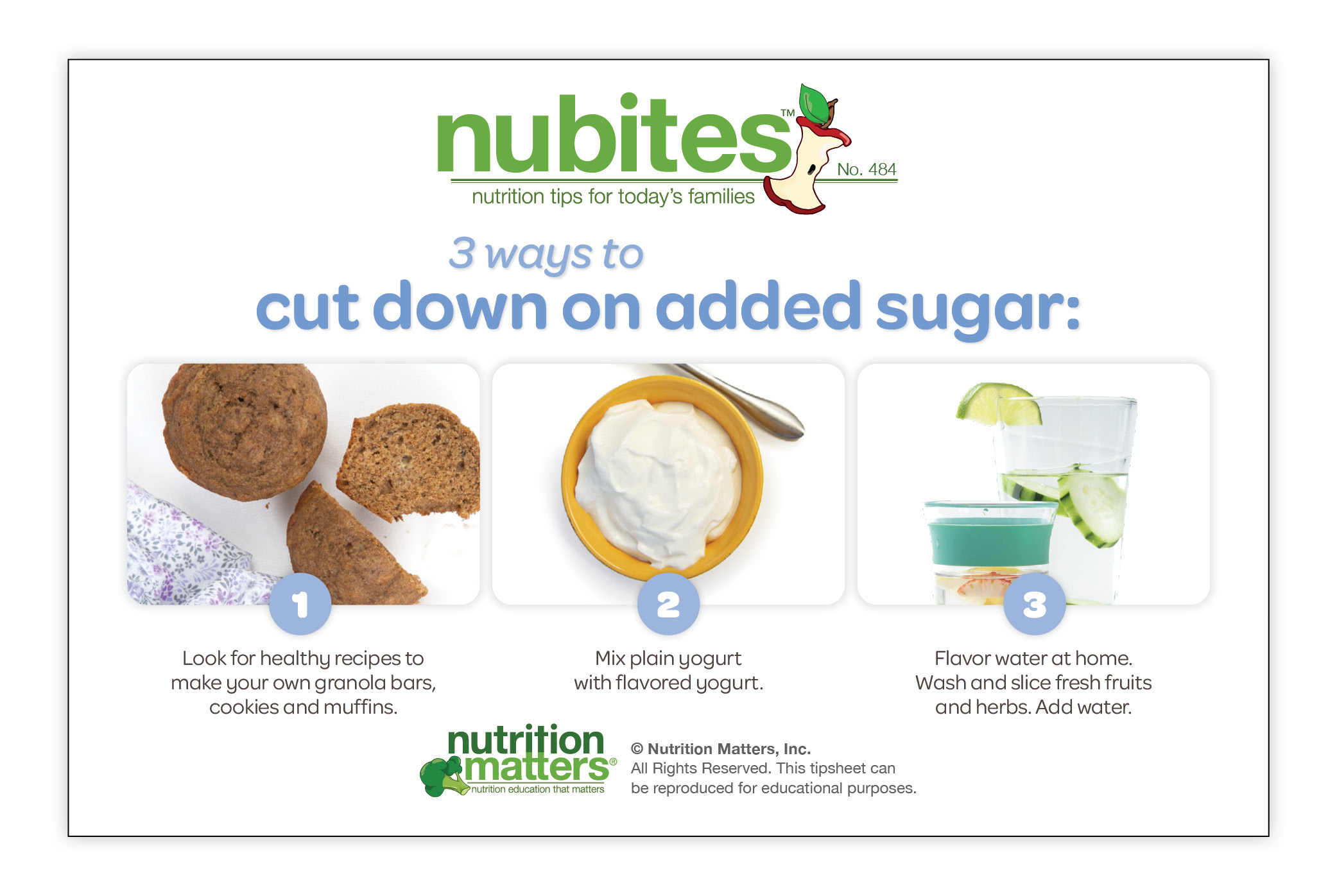 Nutrition Matters Inc. is not responsible for the use of information in the NuBites™ tipsheets. The material provided is for informational purposes only. Nutrition Matters Inc. does not make any representations about the suitability of these materials for other purposes. Nutrition Matters Inc. shall have no liability whatsoever for use of these materials.