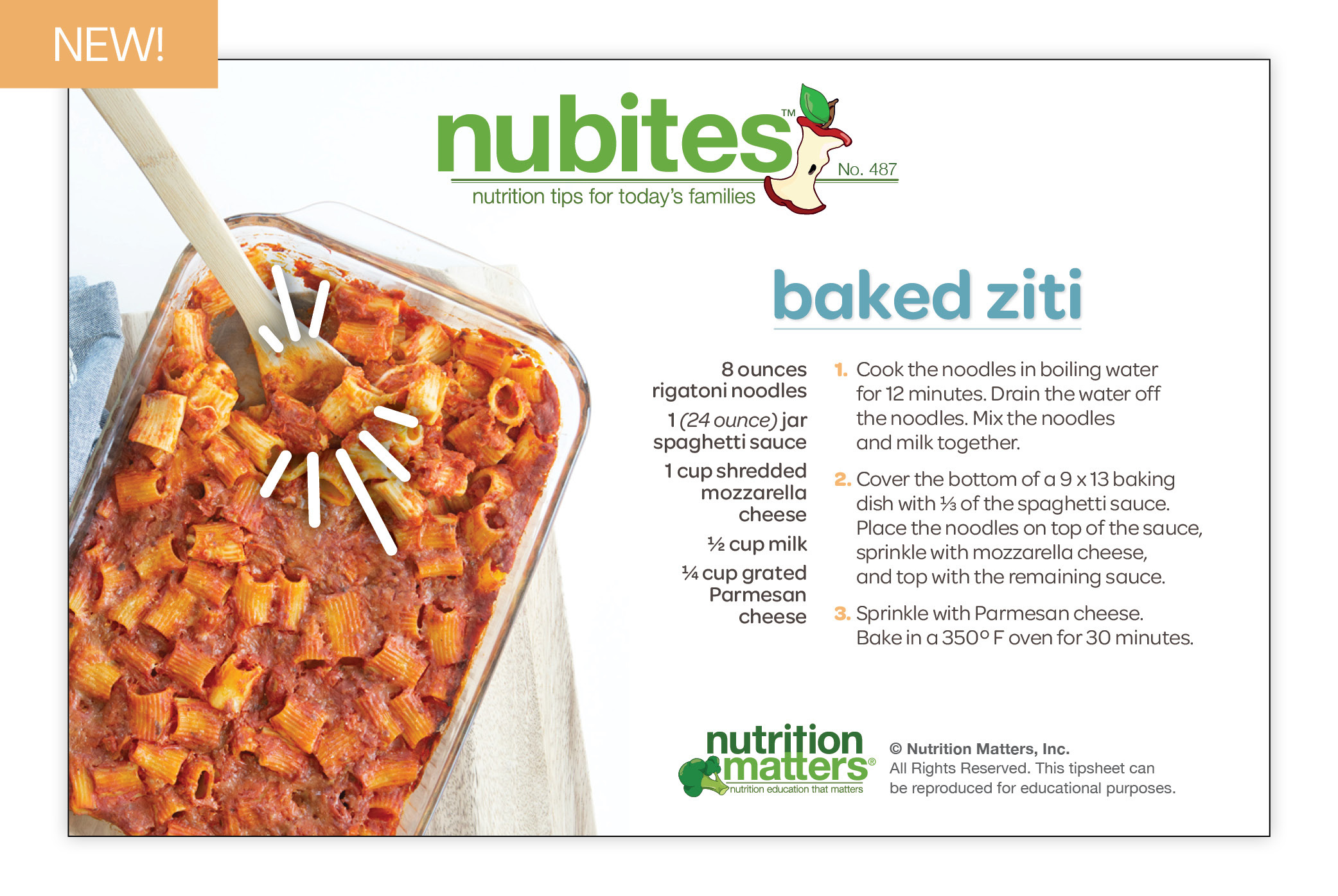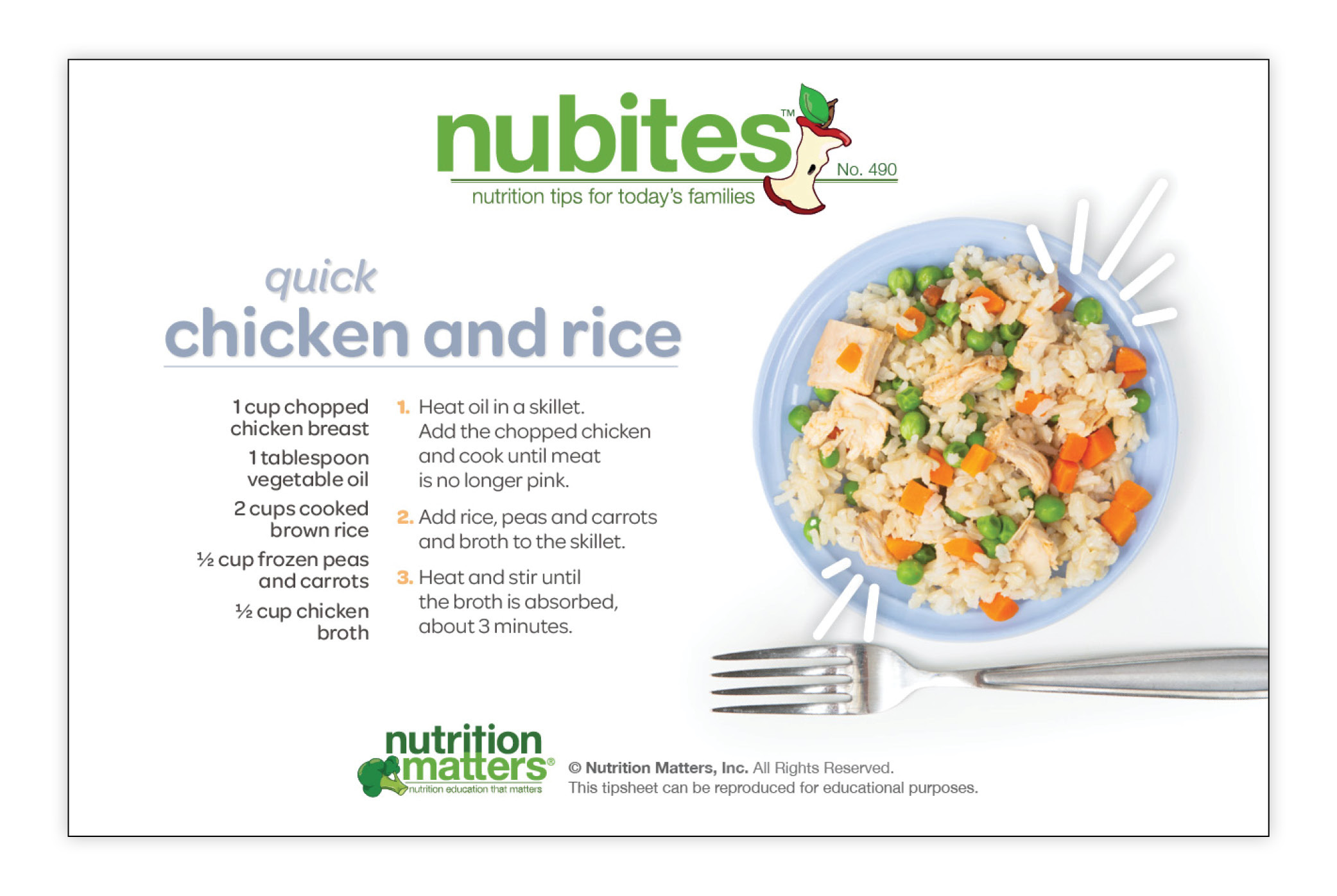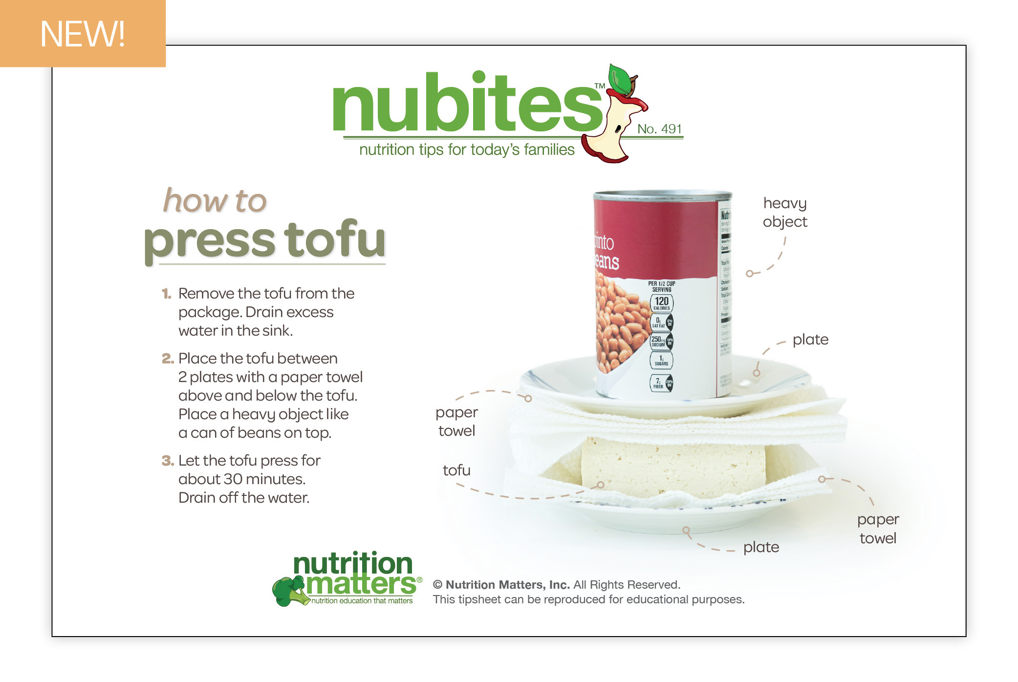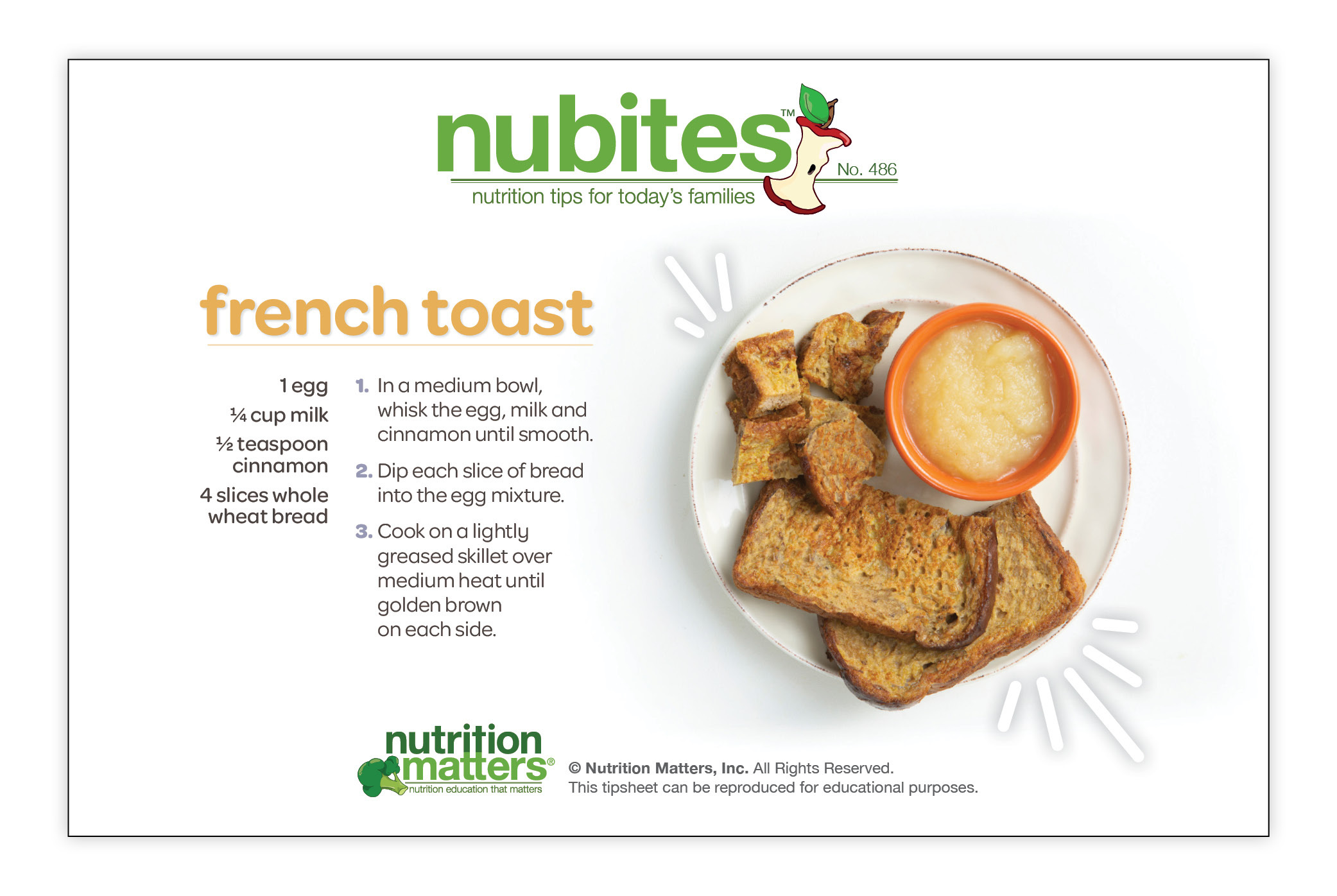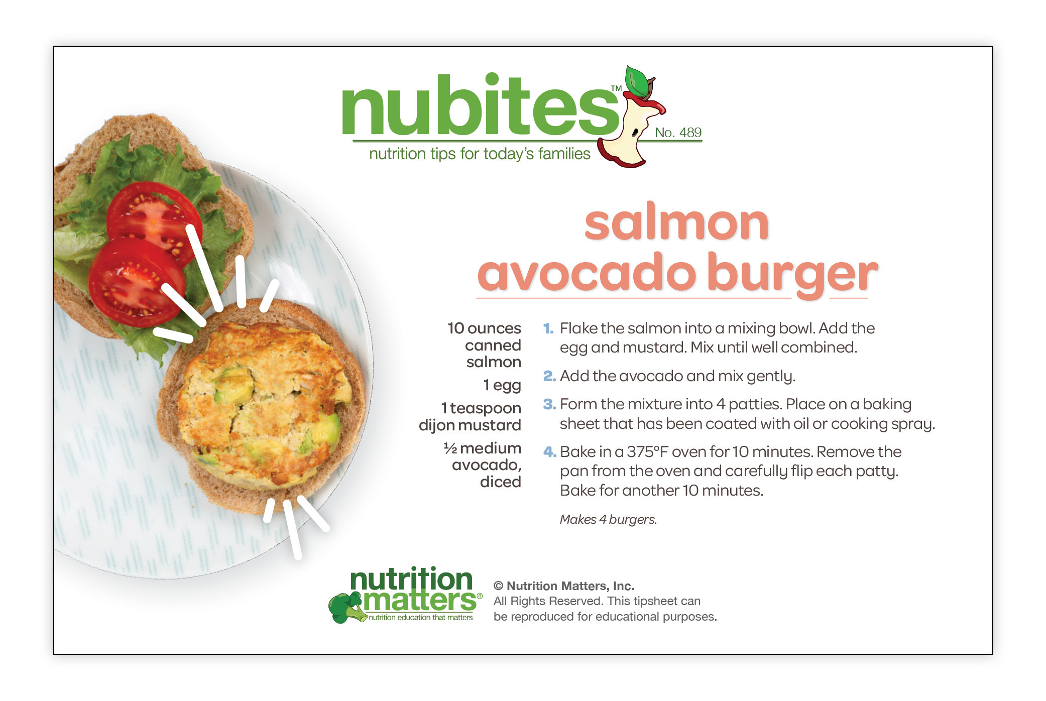 Nutrition Matters Inc. is not responsible for the use of information in the NuBites™ tipsheets. The material provided is for informational purposes only. Nutrition Matters Inc. does not make any representations about the suitability of these materials for other purposes. Nutrition Matters Inc. shall have no liability whatsoever for use of these materials.